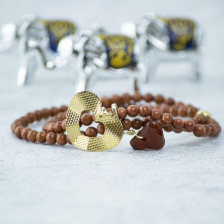 Elaborado en piedra lluvia de oro, dijes en oro golfy y terminales en oro golfy, la lluvia de oro llama el dinero y la abundancia, y el corazón el amor.
