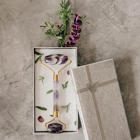 Roller en cuarzo Amatista: Es un rodillo que sirve para aplicar producto en el rostro como: Crema, mascarillas, aceite entre otros. Su función es ayudar a producir colágeno y hacer que el producto penetre en la piel.